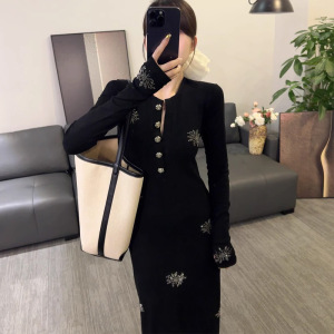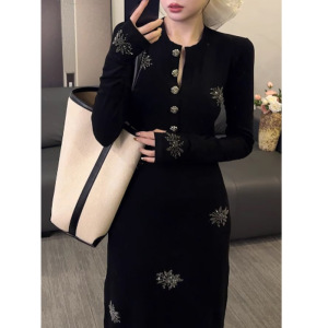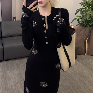秋季新款亮闪闪烫钻高级感V领长袖黑色连衣裙设计感 2025秋季新款