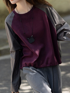 时尚设计感拼色休闲上衣2025秋季圆领宽松微弹褶裥抽绳藏肉卫衣女