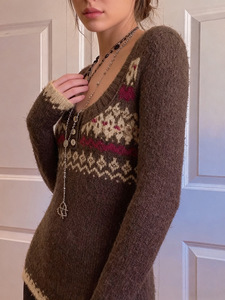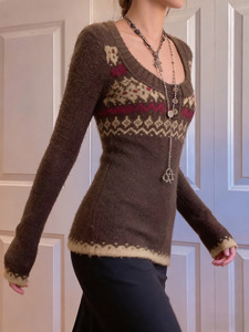 复古民族花纹U领排扣纯色毛衣女新款宽松慵懒风针织衫软糯上衣