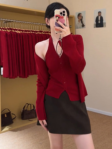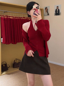 高质量法式秋冬排扣挂脖V领修身显瘦背心红色针织开衫两件套装女