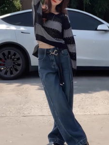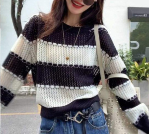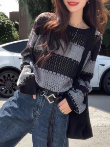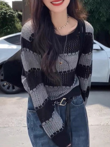 韩系灰色条纹镂空针织衫毛衣女早秋小个子穿搭设计感短款长袖上衣