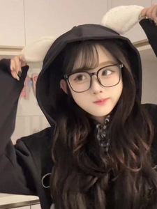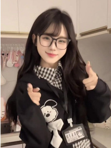 美式复古格子拼接假两件连帽卫衣女秋冬新款宽松可爱小狗上衣外套