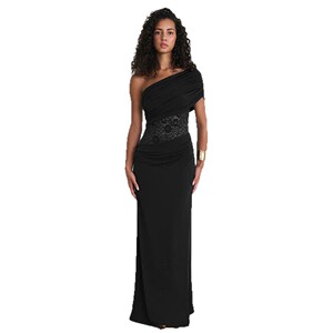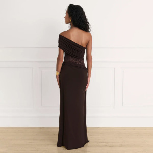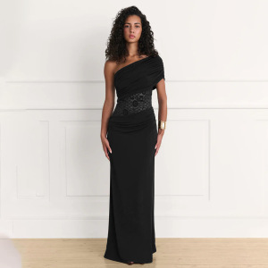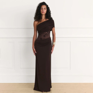 外贸欧美风2025秋季新品时尚单肩蕾丝长裙褶皱修身包臀收腰连衣裙
