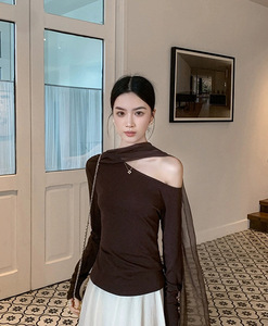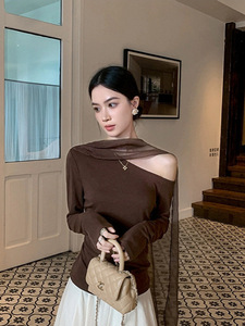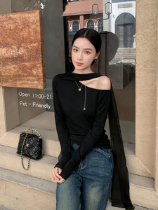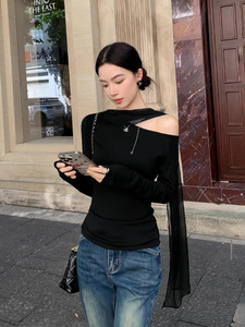御姐风气质飘带斜领露肩长袖T恤女2025秋季新款小众修身显瘦上衣