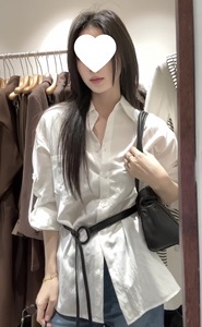 白色气质感长袖衬衫女秋季2025新款宽松小众别致法式腰带上衣