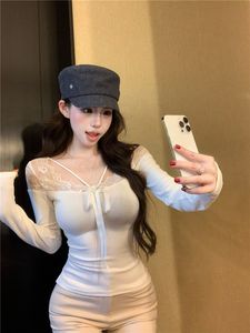 纯欲蕾丝拼接系带v领长袖T恤女秋季黑色修身内搭短款收腰打底上衣