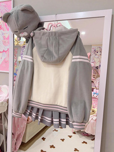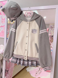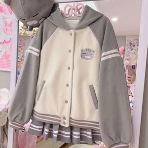 日系丧猫可爱软糯拼色毛呢棒球服女秋冬宽松休闲百搭夹克上衣外套