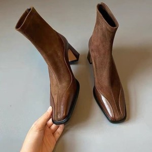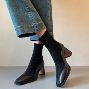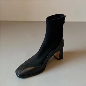 羊皮版~复古拼接瘦瘦靴女新款法式方头百搭增高粗跟短筒弹力袜靴