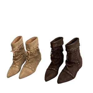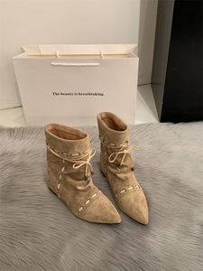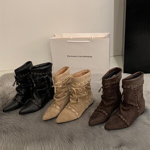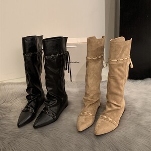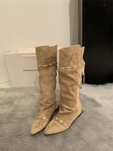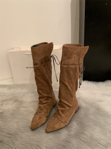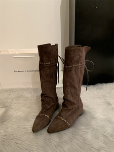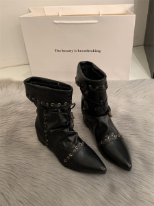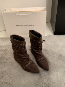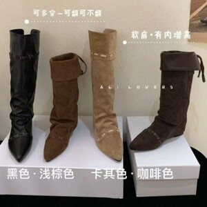 废土辣妹 内增高西部牛仔靴女秋冬堆堆长筒靴系带显瘦不过膝长靴