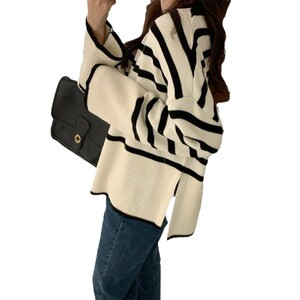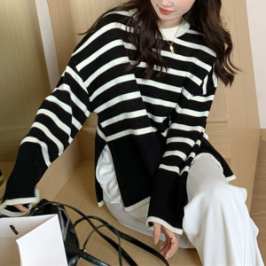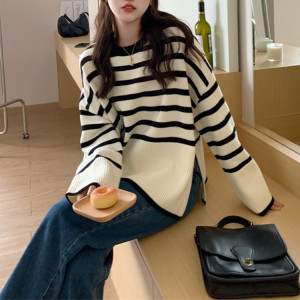 条纹宽松慵懒风针织衫女秋冬新款内穿外搭圆领套头毛衣女打底衫潮