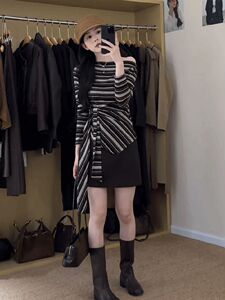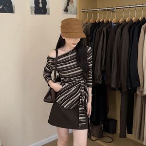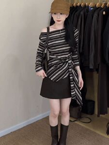 韩系早秋穿搭条纹绑带斜肩上衣女2025秋季新款长袖T恤设计感小众