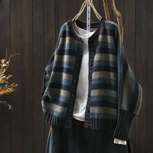 古咖服饰条纹开衫外套女2025秋季棉线针织撞色文艺宽松长袖针织衫