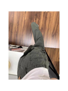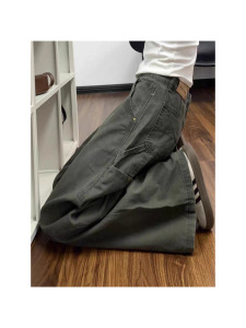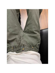 大码复古美式军绿色牛仔裤女秋季胖mm宽松高腰显瘦直筒阔腿工装裤