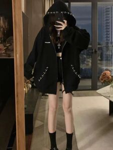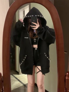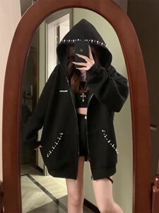 美式复古珍珠连帽钉珠卫衣开衫秋冬季新款刺绣设计感宽松拉链外套