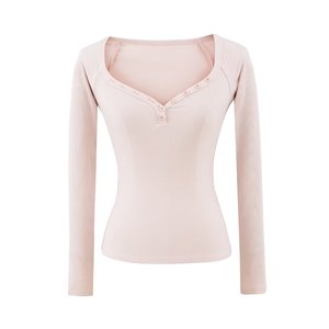 2025秋季女装桃心领扣子收腰长袖T纯色纯欲风上衣T恤