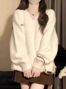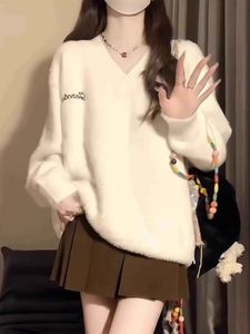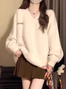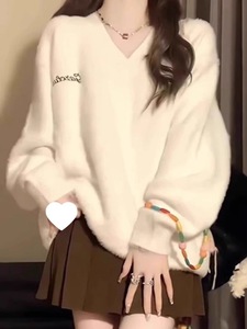 2025秋冬奶fufu白色v领水貂绒毛衣女学生软糯宽松慵懒针织衫上衣
