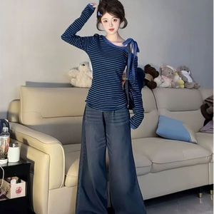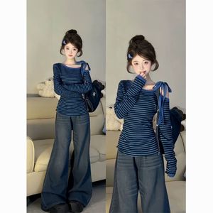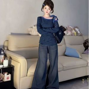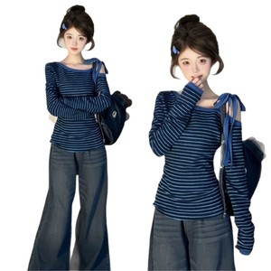 韩系hic条纹露肩长袖t恤女春秋季显瘦设计感别致休闲内搭打底衫潮