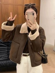 秋冬加绒加厚麂皮毛一体羊羔毛外套高中生女生翻领老钱风夹克干部