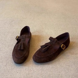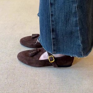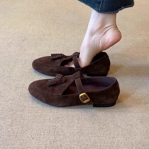 现货~复古法式浅口一字带流苏玛丽珍鞋圆头皮带扣平跟单鞋小皮鞋