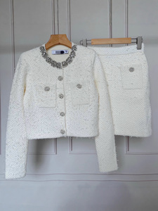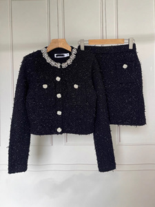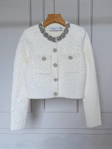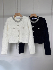 202秋冬新款重工领口镶钻钉珠设计粗花呢圆领气质短外套针织开衫
