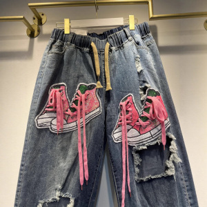 设计感2025秋新款女破洞牛仔裤宽松亮片绣花扎带长裤时尚显瘦休闲