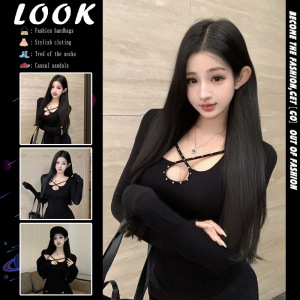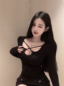 心机辣妹风烫钻交叉镂空长袖T恤小众别致修身显胸大打底黑色上衣