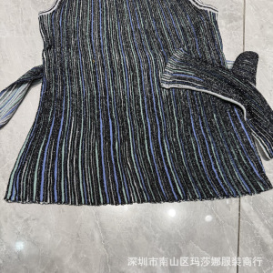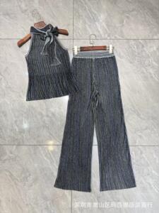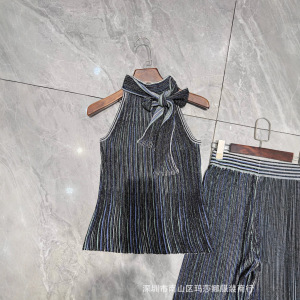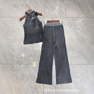 欧美新款时尚气质百搭无袖显瘦针织挂脖彩条纹无袖背心+长裤套装