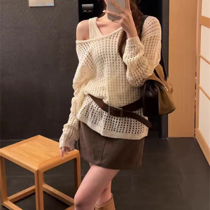 2025秋季新款韩系简约镂空针织假两件腰带洞洞毛衣女百搭针织衫潮