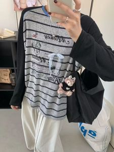 秋季新款韩版休闲时尚简约条纹卡通图案拼色袖宽松长袖T恤衫1145