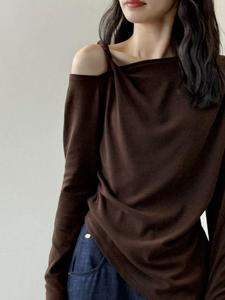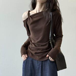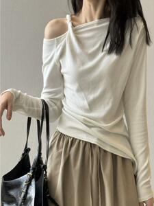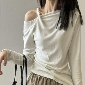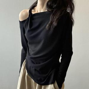 小衫感斜肩扭结长袖T恤女2025秋季新款不规则露肩针织衫