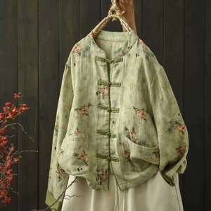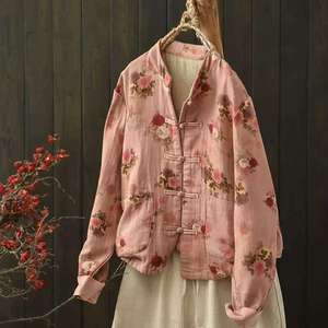 2025秋冬新中式棉质印花开衫外套女立领复古撞色盘扣外搭国风上衣