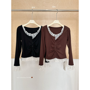塞纳蕾丝拼接假两件长袖针织衫女褶皱修身设计感纯欲撞色打底上衣