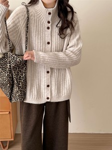 奶fufu温柔风坑条立领毛衣开衫女秋冬季新款宽松复古软糯针织开衫