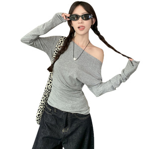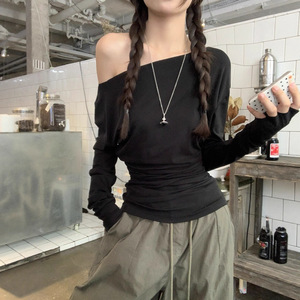 辣妹一字斜领露肩设计感不规则长袖T恤女秋冬穿搭修身打底衫上衣