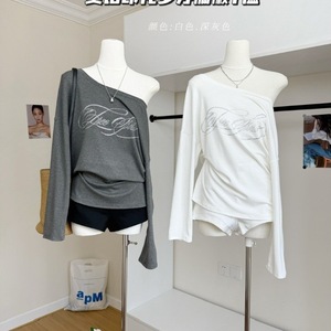 260克人棉烫钻印花多穿慵懒随性长袖T恤白色灰色休闲莫代尔氨纶
