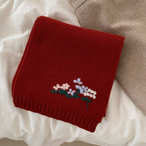 针织围巾秋冬新款刺绣小花保暖护颈围脖秋冬氛围感保暖韩系围巾