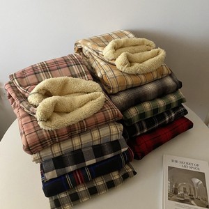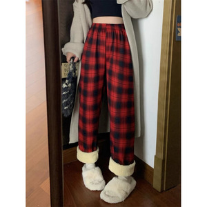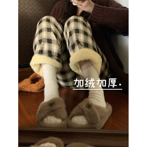 羊羔绒加绒格子裤女小个子阔腿裤秋冬新款高腰直筒裤女垂坠感裤子