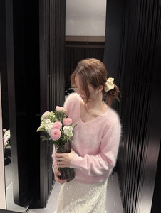 现货/2025秋冬新款韩国氛围感显白樱花粉无缝一体V领拉毛羊毛毛衣