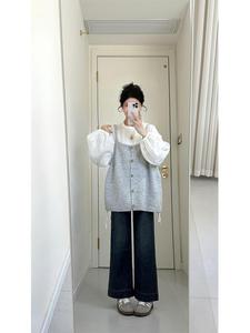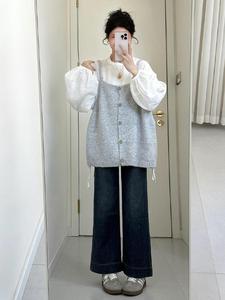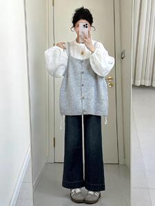 2025秋季新款慵懒风小个子气质穿搭针织吊带白色衬衫牛仔裤三件套