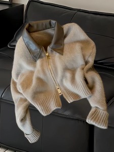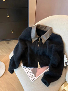 欧货高级感皮POLO领拼接针织开衫双头拉链慵懒风浣熊绒毛衣外套女