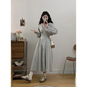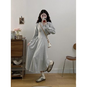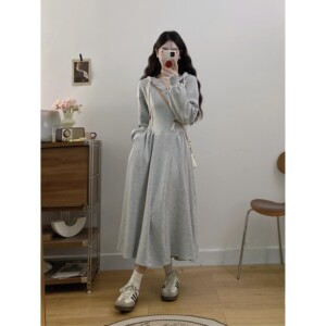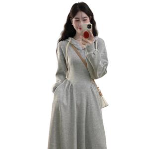秋冬灰色连帽长袖连衣裙子2025新款早秋休闲韩系穿搭收腰卫衣长裙