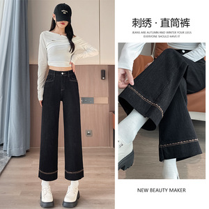 弹力黑金色刺绣牛仔裤女九分时尚复古个性明线装饰小个子八分裤子