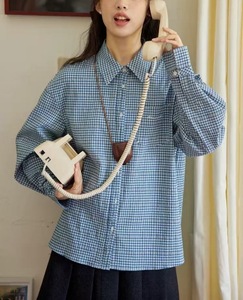 Nov elis 什一 复古字母刺绣长袖衬衣女法式宽松格子衬衫上衣