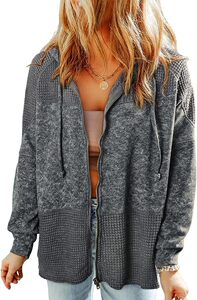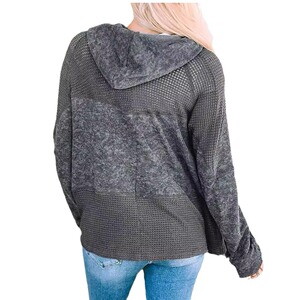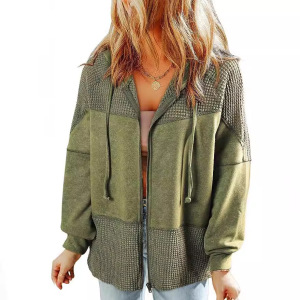 欧美个性拼色连帽夹克衫女秋季新款复古水洗华夫格抽绳长袖上衣女