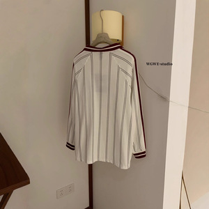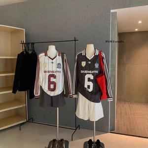 WGWE7160#美式复古球衣短袖T恤撞色条纹V领运动风长袖T恤