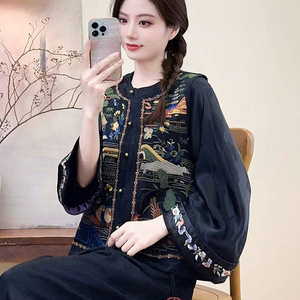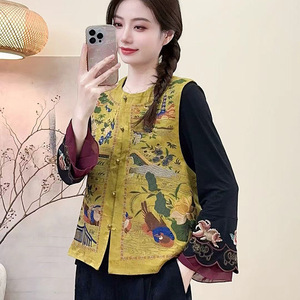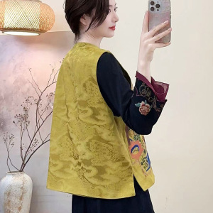 2025秋季新款圆领单排扣无袖坎肩纯色民族风重工刺绣缎面马甲女