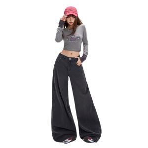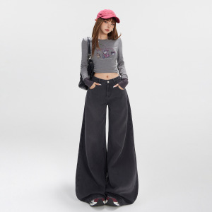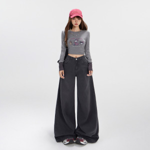 【今茵】美式复古休闲高腰宽松阔腿裤百搭垂感拖地牛仔长裤女新款