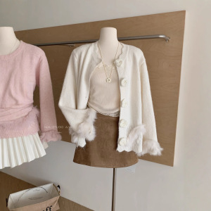 韩系温柔风毛绒拼接针织开衫女秋冬甜美立体花朵宽松软糯毛衣外套