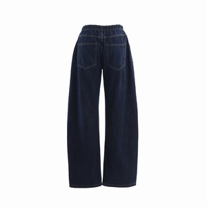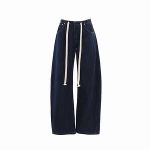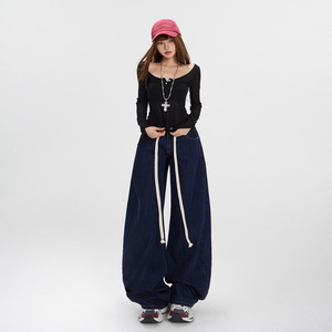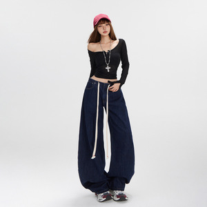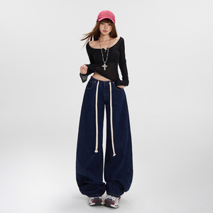 【今茵】美式复古腰头抽绳宽松阔腿休闲牛仔裤子简约百搭弯刀裤女