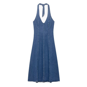 ZA速卖通爆款跨境欧美风女装小众设计感挂脖领牛仔连衣裙